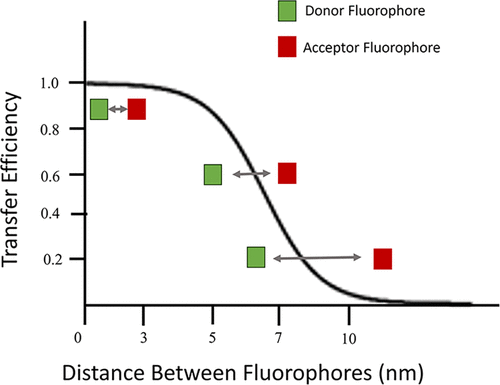 Figure 2. Schematic representation of FRET showing an energy transfer between a donor fluorophore shown in green and an acceptor fluorophore shown in red. The relationship between the distance of the dyes and the efficiency of transfer is shown with the optimal transfer distance being between 1 and 10 nm. The further the dyes move away from each other, the lower the transfer of energy from the donor fluorophore to the acceptor fluorophore.