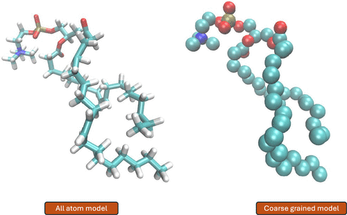 Figure 3. Schematic representation of using coarse-grained systems for MD simulations. In coarse-grained models, groups of atoms are represented as beads, reducing the system’s degrees of freedom. This simplification significantly accelerates simulations, enabling the study of larger systems and longer time scales while reducing computational cost in comparison to to all-atom MD simulations.
