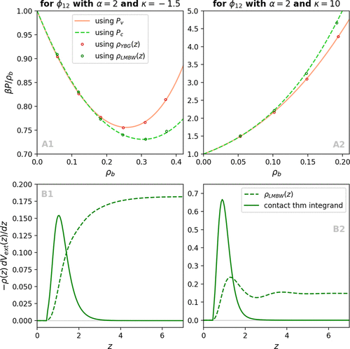 Let us first consider the bulk pair correlations. Thermodynamic quantities can be obtained from these via different routes, namely the compressibility and the virial. If the pair correlation functions are known exactly, then both routes are fully equivalent and yield identical results. However, since this is never the case for realistic model fluids, approximations are required, usually in the form of closures to the Ornstein–Zernike (OZ) integral equation. (22,23) Predictions for thermodynamic quantities, such as the pressure, then become dependent on the chosen route; a phenomenon referred to as thermodynamic inconsistency. (24−26)