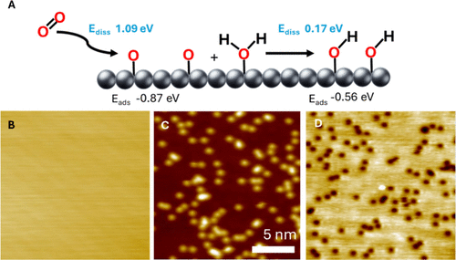 Figure 2. 78 K STM images of the Ag(100) surface before and after exposure to O2 under different imaging conditions. (A) Depiction of oxygen dissociation and reaction with water on the Ag(100) surface and associated reaction energies and activation barriers. Dissociation barriers are shown in blue (Ediss), and adsorption energies are shown beneath in black (Eads). All energy values are relative to gas phase O2. (B) 78 K STM image of the bare Ag(100) surface before exposure to O2. Imaging conditions: 300 mV, 300 pA. (C)-(D) Images of O adatoms (depressions) and OH groups (protrusions) on Ag(100) imaged at (C) 3.00 V, 300 pA, (D) 300 mV, 300 pA. (C) and (D) are of the same area. At 3.00 V, only protrusions are visible, and at 300 mV only depressions are visible. Surface coverages were 1.0% O and 1.5% OH in (C) and (D). All images are 50 × 50 nm2, scale bar shown in C.
