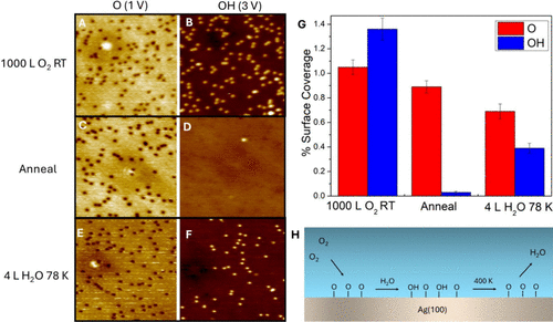Figure 5. Reaction of O atoms with adsorbed H2O. (A) 78 K STM image of 1000 L O2 dosed at 300 K on Ag(100) imaged at 1 V. O adatoms are visible as depressions. (B) Same area imaged at 3 V where OH groups are visible as protrusions. (C) STM image of O–Ag(100) surface after a 400 K anneal scanned at 1 V. (D) Same area scanned at 3 V showing a significant reduction in the number of OH species. (E) STM image of the surface after 3 L H2O was dosed at 78 K, annealed to 400 K, and then imaged at 1 V at 78 K. (F) Same area imaged at 3.0 V showing an increase in the number of OH species. (G) Quantification of the surface coverages of O and OH for each stage of the experiment. (H) Schematic summarizing O2 dissociation, OH formation, and water desorption from Ag(100). Tunneling current was constant for all STM images at 300 pA. All images are 50 × 50 nm2.