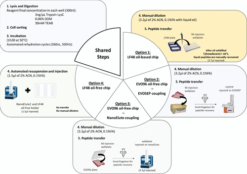Figure 1. Four single-cell sample preparation protocols benchmarked using the cellenONE sorter/liquid dispenser. Lysis and digestion, followed by incubation with automated rehydration cycles are common steps to all three workflows. Then, option 1 relies on a LF48 oil-based plate support involving a manual dilution step in liquid oil, followed by a manual peptide transfer after oil solidification (Tf (hexadecane) = 18 °C); option 2 uses an EVO96 oil-free plate support, involving manual dilution followed by peptide loading onto preconditioned EVOTIPs after centrifugation for injection on the Evosep system; option 3 employs the same EVO96 oil-free support, repurposed for nanoElute injection, where peptides are transferred into a 96-well injection plate via centrifugation; and option 4 relies on a LF48 oil-free plate support suited for automated resuspension and direct injection on a nanoElute 2 system.
