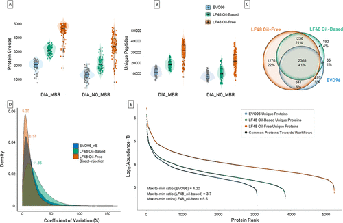 Figure 2. Benchmarking of three single-cell proteomics workflows (EVO96 (blue), LF48 oil-based (green), and LF48 oil-free (orange)) run on nanoElute 2 on 96 single-cell replicates per workflow. (A) Violin plots representing the number of protein groups identified per single cell for each tested workflow using DIA-NN with MBR (left) and without MBR (right). (B) Violin plots representing the number of unique peptides identified per single cell for each tested workflow using DIA-NN with MBR (left) and without MBR (right). (C) Venn diagram showing proteins’ overlap across the three workflows. (D) Coefficients of variation (CVs) density distributions across the three sample preparation workflows. (E) Protein abundance ranking plot comparing the dynamic range of protein groups across the three workflows. Black dots correspond to the shared proteins across the conditions, whereas the colored ones correspond to unique proteins per condition.