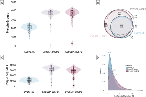 Figure 3. Comparison of SCP EVO96-based workflows across two chromatographic systems. EVO96_nE was analyzed on a nanoElute 2 system (N = 96 single-cells) compared to two Evosep workflows that were acquired using two sample throughputs (80 and 120SPD with N = 40 single-cell replicates each). (A) Violin plots representing the number of protein groups identified per single cell for each workflow (EVO96_nE in blue, EVOSEP80SPD in gray, and EVOSEP120SPD in purple). (B) Venn diagram showing the overlap of identified protein groups across the workflows. (C) Violin plots representing the number of unique peptides identified per single cell for each workflow (EVO96_nE in blue, EVOSEP_80SPD in gray, and EVOSEP_120SPD in purple). (D) Density distributions of protein abundance coefficients of variation (CVs) across the three workflows.