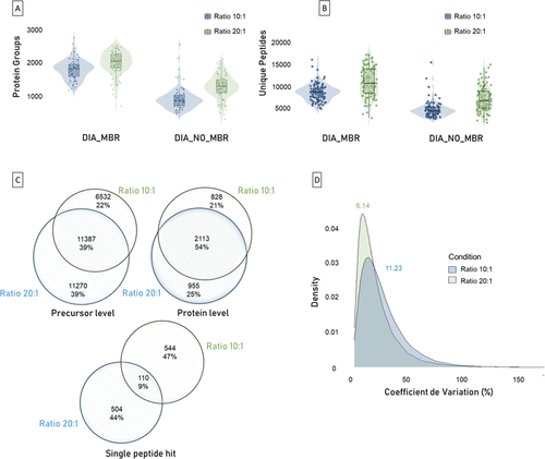 Figure 4. Evaluation of Trypsin-LysC digestion ratios. This figure presents a comprehensive analysis of HeLa single cells (N = 96 single-cell replicates per condition), comparing two digestion ratios (10:1 and 20:1). (A) Violin plots showing the distributions of protein groups identified per single-cell replicates under each digestion ratio, with or without MBR processing. (B) Violin plots showing the distributions of unique peptides identified per single-cell replicates under each digestion ratio, with or without MBR processing. (C) Venn diagrams illustrate the overlap in identified precursors (left), protein groups (right), and single-peptide hit proteins (down) between the two digestion ratios. (D) Density plots represent the distribution of coefficient of variation (CV) values across single cells.