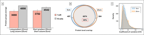 Figure 5. Gradient time and column length optimizations. (A) Average and standard deviation of the number of proteins identified per single-cell replicate (pink, N = 10) and per ten cells’ replicates (gray, N = 2), analyzed using 5 and 25 cm IonOpticks separation columns. (B) Union of all proteins identified across all 5 cm column replicates (blue) versus the union of all proteins identified across all 25 cm column replicates (orange). (C) The blue and orange dashed lines indicate the mean CV values calculated for 250 pg HeLa QC lysates (N = 3) run on a 5 cm (average 3753 protein group IDs) versus 25 cm (average 3585 protein group IDs) column, respectively.