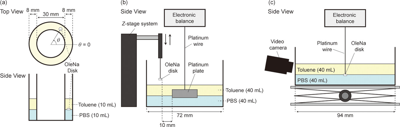 Figure 1. Schematic illustration of (a) the experimental apparatus for observing a self-propelled OleNa disk placed at an oil/aqueous interface, (b) the measurement of the interfacial tension, and (c) the simultaneous measurement of the interfacial tension and movie around the OleNa disk fixed at the oil/aqueous interface. In (a), θ and θ = 0 were defined to analyze the motion in the polar coordinates.