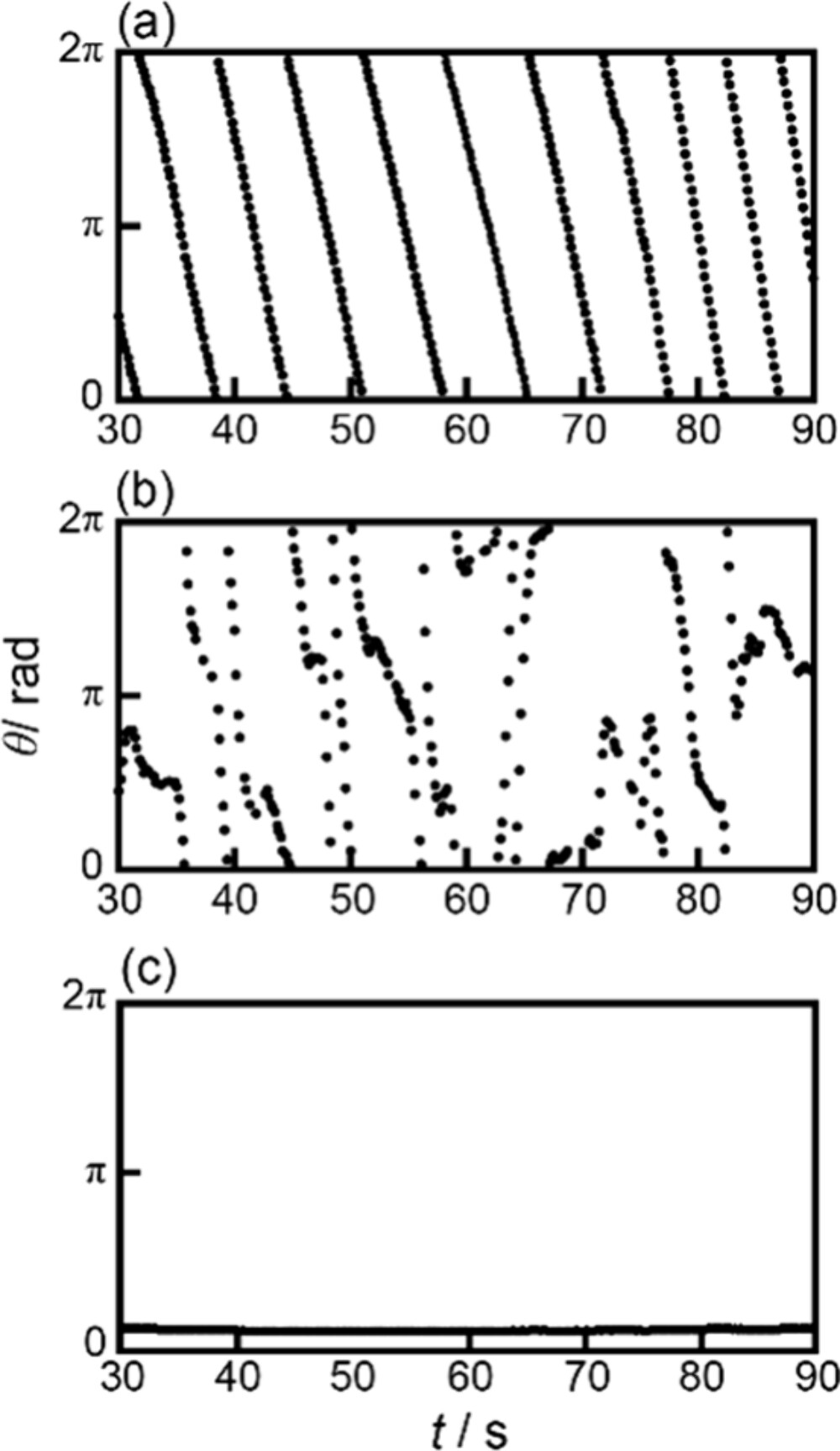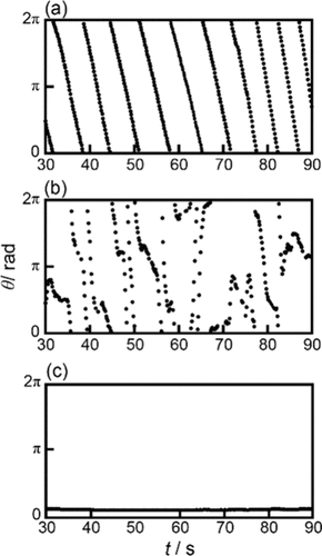 Figure 2. Time variations of θ for self-propulsion of an OleNa disk at pH = (a) 6.0, (b) 8.0, and (c) 12.0. θ and θ = 0 are defined in Figure 1. The movies of motion in parts (a) and (b) are provided in the Supporting Information as Movies S1 and S2, respectively.