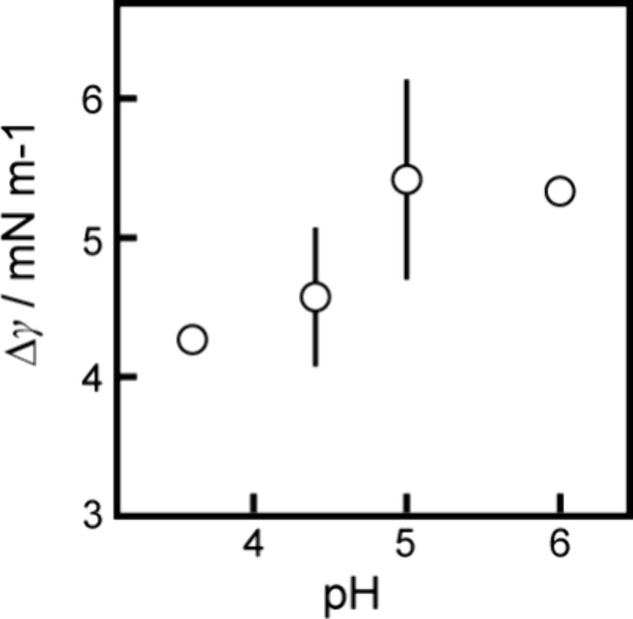 Figure 5. Difference in the interfacial tension, Δγ (= γ0 – γs), at the equilibrium state, depending on the pH of the aqueous phase, where γs and γ0 are the interfacial tension at the oil/aqueous interface with and without OleNa in the aqueous and oil phase, respectively. Error bars represent the standard deviation obtained from three examinations.