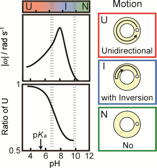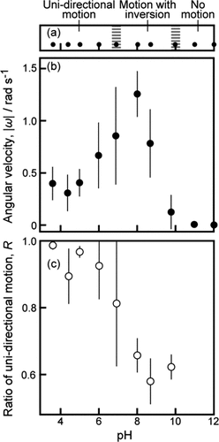 Figure 3. (a) Phase diagram of self-propelled motion, (b) absolute value of angular speed, |ω|, and (c) ratio of unidirectional motion per 1 min, R, depending on pH of the aqueous phase. Error bars represent the standard deviations obtained from three or four examinations. In the boundary regions at pH 6.9 and 9.8 in (a), both unidirectional motion and motion with inversion were observed, and both motion with inversion and no motion were observed, respectively.
