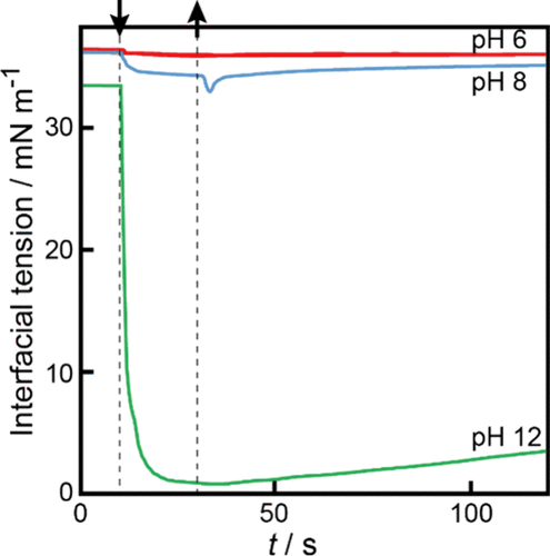 Figure 4. Time variation of the oil/aqueous interfacial tension at pH 6.0 (red line), 8.0 (blue line), and 12.0 (green line). The downward and upward arrows denote the time when the OleNa disk is placed in contact with the interface from above (t = 10 s) and when it is moved upward away from the interface to the air phase (t = 30 s), respectively.