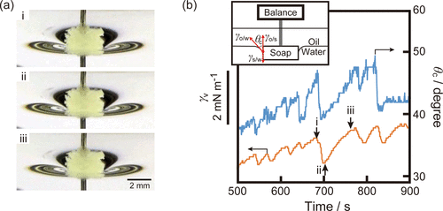 Figure 6. (a) Snapshots of the OleNa disk fixed on the interface at pH 8.0 at t = (i) 680, (ii) 700, and (iii) 760 s (slanted view). The movie at pH 8.0 is provided in the Supporting Information as Movie S3 (500 ≤ t ≤ 900 s). (b) Simultaneous measurement of the time variation of the sum of γs/w, γo/s, and γo/w in the vertical direction (γv) and the complementary contact angle (θc). The data were smoothed by a seven-point moving average (corresponding to ±3 frames, total ∼1.2 s) to reduce noise. The original time resolution was 0.167 s per frame. The vertical position of the disk was adjusted so that the upper surface of the disk almost coincided with the oil/aqueous interface. We confirmed the reproducibility of the oscillatory phenomena.
