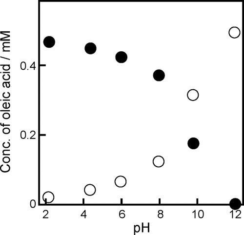 Figure 7. Total concentration of oleic acid in the oil (filled circles) and aqueous (empty circles) phases estimated at different pH values.