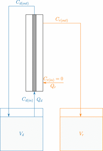 Figure 2. Diagram of the HFM setup showing the volumetric flow rate (Q), concentrations (C), and volumes (V) associated with the donor (blue) and receiver (orange) circuits. The donor circuit is recycled, while the receiver circuit is single-pass to provide a constant physical sink.
