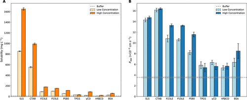 Figure 5. (A) Bar plot comparing the thermodynamic equilibrium solubility of GRS in various receiver media at low and high concentrations. The concentrations are available in Figure 3. The horizontal dashed line represents the buffer solubility (10.27 ± 0.14 mg L–1). B. Bar plot comparing Papp values obtained from GRS permeation studies, illustrating the influence of a solubilizing receiver. The horizontal dashed line represents the buffer Papp (3.56 ± 0.22 × 10–5 cm s–1). Error bars and shaded regions represent SEM in both cases (n = 3). Both plots were derived using data sampled from the receiver vessel.