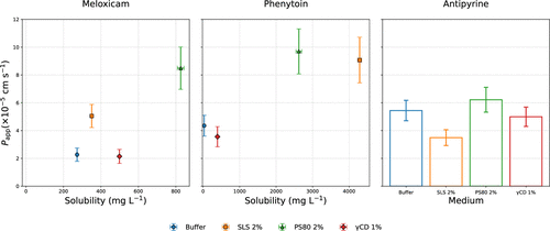 Figure 6. Scatter plot showing the variation in Papp with solubility for MLX and PHT. Note that the equilibrium buffer solubility of MLX (272.68 ± 3.87 mg L–1) was higher than that of PHT (29.33 ± 0.61 mg L–1) which is relevant for the calculation of H. Only variations in Papp are shown for APY as solubility exceeded 1 g mL–1 in all media. Error bars represent SEM (n = 3)