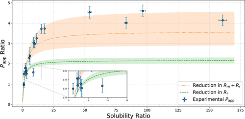 Figure 7. Plot of Papp ratio versus solubility ratio for GRS. Error bars represent SEM (n = 3), with error being propagated to account for the calculation of a ratio. The shaded region on the two theoretical curves reflect the standard error of the y-intercept on the relevant Wilson plots.