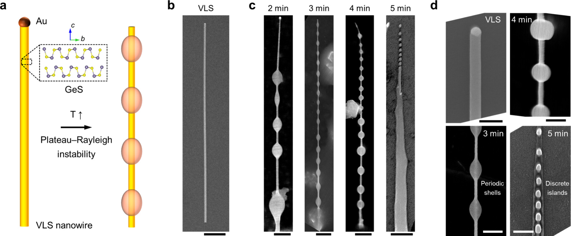 Figure 1. Periodic shell formation on a GeS van der Waals nanowire via the Plateau–Rayleigh (P-R) instability. (a) Schematic illustration showing the formation of a periodic core–shell GeS nanowire from a VLS-grown straight nanowire, driven by the P-R instability at elevated temperature. Inset highlights orthorhombic GeS crystal structure where the vdW layers are transversely stacked relative to the axial direction. (b) SEM image of a straight GeS nanowire grown from an Au catalyst. The growth was conducted by nucleating at 380 °C for 3 min and elongating at 300 °C for 10 min. The pressure and Ar carrier gas flow rate were 20 Torr and 50 sccm, respectively. Scale bar, 1 μm. (c) SEM images showing the evolution of periodic core–shell structure. The growth was continued at 390 °C, under a pressure of 20 Torr and an Ar gas flow rate of 50 sccm, for growth times (tg) of 2–5 min (from left to right). Scale bars, 500 nm. (d) Magnified SEM plan views of GeS nanowires. Top left: A straight VLS nanowire with its growth front decorated with an Au catalytic droplet. Bottom left and Top right: Core–shell structures showing periodic shells at tg = 3 and 4 min, respectively. Bottom right: Discrete islands formed by the P-R instability at tg = 5 min. Scale bars, 200 nm.