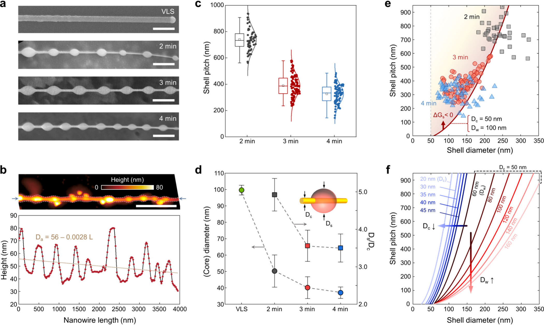 Figure 3. Time-dependent periodic shell formation on GeS nanowire sidewalls. (a) SEM images showing the morphological evolution of GeS nanowire. A VLS nanowire with straight and uniform sidewall grown at 300 °C, periodic core–shell structures after growth for 2, 3, and 4 min at 390 °C (top to bottom). Scale bars, 500 nm. (b) AFM height map (top) and corresponding axial line profile (bottom) of a representative periodic core–shell nanowire with tg = 3 min. The profile shows a periodic height modulation superimposed on a gradual decrease in the average height from base (left) to tip (right). Scale bar, 1 μm. (c) Statistical distribution of the shell pitch as a function of growth time. (d) Nanowire (core) diameter (Dc, left axis) and the shell-to-core diameter ratio (Ds/Dc, right axis) as a function of growth time. The inset illustrates the definitions of these parameters. (e) Experimentally measured correlation between shell pitch and shell diameter for different growth times. The data are overlaid with a theoretical model prediction, where the solid red line indicates the thermodynamic threshold for spontaneous periodic shell formation (ΔGs < 0) for Dc = 50 nm and Dw = 100 nm, where Dw is the fictitious diameter of a conformal shell. (f) Theoretical stability diagram derived from the model, showing the calculated instability threshold as a function of shell diameter and pitch for various core and fictitious conformal shell diameters.