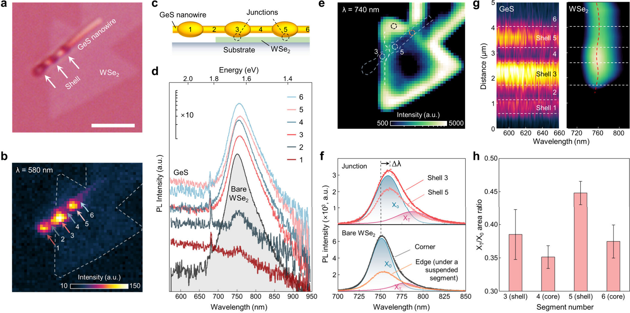 Figure 4. Spatially modulated optoelectronic properties of GeS/WSe2 mixed-dimensional vdW heterostructure. (a) OM image of a periodic core–shell GeS nanowire transferred onto a monolayer WSe2. Scale bar, 3 μm. (b) PL intensity map corresponding to the GeS emission (λ = 580 nm), showing emission is brightest at the shell segments (1, 3, 5). (c) Schematic illustration of the heterostructure, highlighting the direct vdW junctions formed between the GeS shells (i.e., 3, 5) and the underlying WSe2. (d) PL spectra from numbered nanowire points and a bare WSe2 region (black), showing broad GeS (λ ≤ 680 nm) and sharp WSe2 (∼750 nm) exciton peaks. Spectra are offset for clarity. (e) PL intensity map of the WSe2 emission (λ = 740 nm), confirming strong, localized PL quenching at the GeS shell junctions. Dashed circles indicate the locations of the spectra shown in (f). (f) Deconvoluted PL spectra from representative ‘Junction’ (top) and ‘Pristine’ (bottom) regions, as marked in (e). The peaks are fitted to a neutral exciton (X0) and a lower-energy trion (XT). The junction spectra exhibit a significant redshift (Δλ = 10 nm) and an enhanced trion contribution. (g) Spatially resolved hyperspectral maps along the nanowire axis, showing the direct correlation between the GeS PL intensity modulation and the redshift of the WSe2 PL at the shell junctions. Color scales are identical to those in (b) and (e). (h) Ratio of the integrated trion-to-exciton peak areas for junction segments located on the WSe2 flake, confirming a local enhancement of the trion population specifically at the shell junctions (3 and 5).