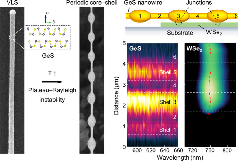 SEM image of Au nanoparticles dispersed on Si substrate and optical microscopic images of as-grown and dry-transferred GeS nanowires. TEM and EDS analyses of straight and core–shell nanowires. EDS spectra of core–shell GeS nanowires. Raman spectrum of a periodic core–shell GeS nanowire. Additional SEM images of periodic core–shell GeS nanowires at different growth durations. Statistical distributions of shell diameters and shell contact angles as a function of growth time. Comparison of shell-thicknesses measurements by AFM and SEM. Shell and core diameter comparison between upper and lower segments. Comparison of core and shell diameters at the upper and lower segments in periodic nanowires. Schematic comparing periodic shell and conformal shell structures. PL measurements on a core–shell GeS nanowire. PL spectra comparison between shell contact and intershell regions. UPS analysis of GeS. Superimposed PL intensity maps at the GeS and WSe2 emission wavelengths. PL peak deconvolution near the GeS/WSe2 junction regions. Comparison of P-R instability in nanowires reported in previous studies. (PDF)