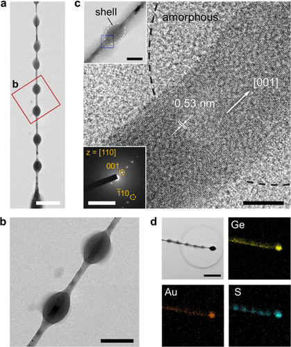 Figure 2. Structural analysis of GeS periodic shell nanowires. (a) Bright-field TEM image of a GeS periodic shell nanowire (tg = 3 min). Scale bar, 500 nm. (b) Magnified TEM image of the region marked by the red square in (a). Scale bar, 200 nm. (c) High-resolution TEM image of the crystalline core and amorphous shell, corresponding to the area in the blue box region of the top-left inset. The image shows a lattice spacing of 0.53 nm and confirms the axial orientation is along the [001] direction. Bottom left inset: Corresponding SAED pattern from a [110] zone axis, validating the axial orientation along the c-axis. Scale bars, 10 nm (main image), 100 nm (top-left inset), and 100 nm–1. (d) EDS elemental mapping images of the GeS periodic shell nanowire. Scale bar, 500 nm.