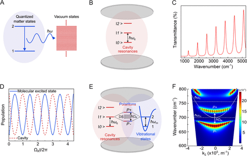 Figure 1. (A) Two-level atomic system with quantized energy levels emitting a photon into a continuum of vacuum states. (B) Schematic illustration of a Fabry–Pérot cavity with its resonances. (C) FT-IR transmission spectrum showing the resonances of a Fabry–Perot cavity of 8 μm path length filled with air. Schematic representation of (D) the energy exchange between a lossless cavity and a molecule resulting in the Rabi oscillation and (E) the resulting strong coupling and formation of the light–matter hybrid states in a cavity. (F) Angle-dependent dispersion of the polaritonic states with respect to the in-plane wave vector (black diamonds) overlaid on the simulated dispersion contour of the uncoupled cavity mode (ℏωc = 698 cm–1) and the vibrational transition of PS (ℏωm = 698 cm–1). Adapted from ref (34). Copyright 2024 American Chemical Society.