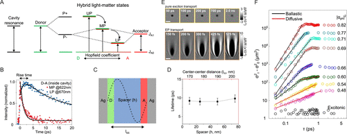 Figure 2. (A) Schematic representation of strong coupling of the electronic transitions of the donor and acceptor, together with a cavity resonance, resulting in three polaritonic states: the upper polariton (UP), middle polariton (MP), and lower polariton (LP). Reproduced from ref (30). Copyright 2016 John Wiley and Sons. (B) Excited-state dynamics of MP and LP. Adapted from ref (30). Copyright 2016 John Wiley and Sons. (C) Schematic representation of a cavity containing spatially separated donors and acceptors. The spatial separation corresponds to the thickness (h) of the polymer layer. Reproduced from ref (31). Copyright 2017 John Wiley and Sons. (D) Lifetime of MP as a function of the spacer thickness in the strong coupling conditions. Adapted from ref (31). Copyright 2017 John Wiley and Sons. (E) Momentum-resolved ultrafast imaging of pure exciton transport (top panel) and polariton transport (bottom panel). Reproduced from ref (48). Available under a CC-BY 4.0 license. Copyright 2023 Xu et al. (F) Time-resolved dynamics of the variance of polariton cloud expansion measured at different photonic fractions showing the ballistic and diffusive energy transport mediated by polaritons. Adapted from ref (47). Copyright 2023 Springer Nature.