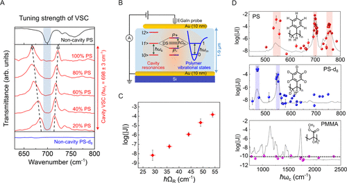 Figure 4. (A) FT-IR transmission spectra of cavities strongly coupled to the δ(Ar. CH) modes of PS when mixed with different weight percents of PS-d8. (B) Schematic illustration of VSC resulting in polaritonic states and the electrical conductance measurement setup. (C) Variation in conductance as a function of the strong coupling strength. (D) Action spectra of the electrical conductivity of aromatic polymers (PS and PS-d8) and nonaromatic polymer (PMMA) inside the cavity. The cavity modes are tuned with respect to the different vibrations of the polymers. The red, blue, and pink spheres correspond to the current densities of PS, PS-d8, and PMMA, respectively. Adapted from ref (34). Copyright 2024 American Chemical Society.