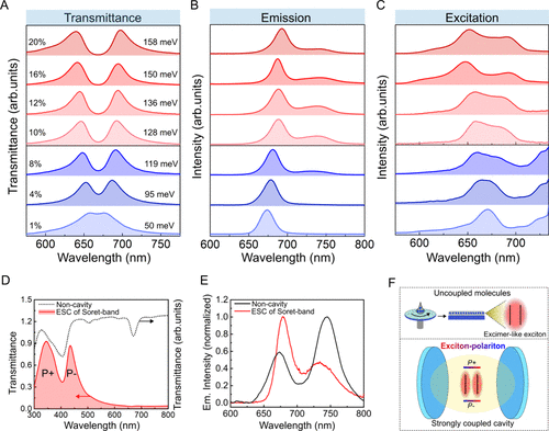 Figure 6. (A–C) Transmittance, emission (λex = 450 nm), and excitation (for λem = 770 nm) spectra of cavities ranging from weak (purple curves) to strong (red curves) coupling of the Ce6T Q band. (D and E) Transmittance, emission, and excitation (for λem = 770 nm) spectra of the Ce6T thin film and cavity strongly coupled to the Soret band. (F) Schematic illustration of the excimer-like exciton formation between two interacting Ce6T molecules in a noncavity film upon spin coating (top panel). The bottom panel shows the Ce6T molecules with a suppressed intermolecular interaction under ESC. Reproduced from ref (42). Available under a CC BY-NC-ND 4.0 license. Copyright 2025 Biswas et al.