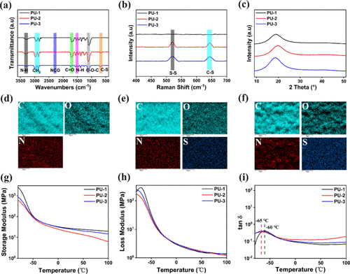 Figure 2. (a) FTIR spectra of PU-1, PU-2, and PU-3 elastomers. (b) Raman spectra. (c) XRD patterns. (d–f) Elemental mapping images of PU-1, PU-2, and PU-3 obtained from EDS. (g) Storage modulus (E′). (h) Loss modulus (E″). (i) Loss factor (tan δ).
