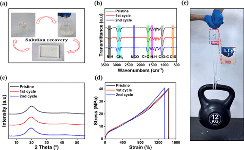 Figure 5. (a) Schematic illustration of the recycling process of the PU-3 elastomer. (b) FTIR spectra of the original and recycled PU-3 sample. (c) XRD patterns of the original and recycled PU-3 sample. (d) Stress–strain curves of PU-3 after two recycling cycles. (e) Demonstration of the recycled PU-3 elastomer lifting a 12 kg weight.