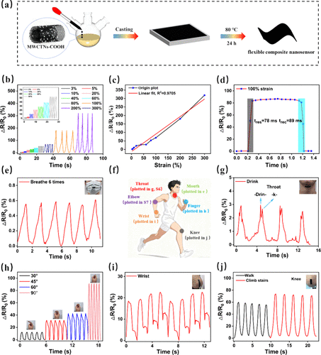 Figure 6. (a) Schematic illustration of the fabrication process of the flexible and sensitive polymer/carbon nanotube composite nanosensor. (b) Relative resistance variation (ΔR/R0) of the sensor under tensile strains ranging from 3% to 300%. (c) GF of the nanosensor, where GF = ΔR/(R0·ε) and ε denotes strain. (d) Response and recovery times of the sensor at 100% strain. (e) Real-time signal output of the sensor during mouth breathing. (f) Schematic representation of the potential applications in human motion monitoring. (g) Signal response of the sensor during throat articulation of the word “drink”. (h) Electrical response of the sensor during finger bending and stretching at angles of 30°, 45°, 60°, and 90°. (i) Signal output during wrist bending and (j) signal response during walking and stair climbing.