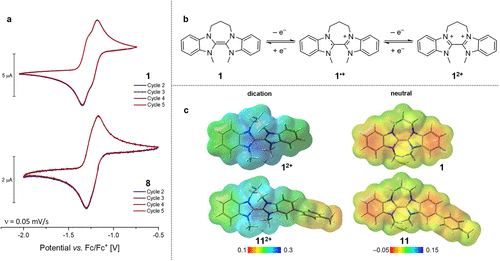 Figure 2. (a) Cyclic voltammograms of the salt of 1(PF6)2 (1 mM in DMF, top) and of monomer 8 (1 mM in DMSO, bottom) with 0.1 M n-Bu4NPF6; working electrode: glassy carbon (⌀ = 2 mm). (b) Expected redox reactions of SED 1 to its dication 12+ via radical cation 1•+. (c) Electrostatic potential maps of dicationic and neutral BBI 1 and a tolyl-substituted BBI (B3LYP/6–311+G(d), isovalue 0.02).