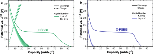 Figure 3. Electrochemical properties of PSBBI and X-PSBBI-based coated composite electrodes with 1M LiPF6 in EC/DMC 1:1 (v/v) as electrolyte. (a) Charge/discharge curves at a rate of 0.1C of PSBBI electrodes (PSBBI/Super C65/KB600/PVDF (50:20:20:10), active material mass loading: 0.621 mg). (b) Charge/discharge curves at a rate of 0.1C of X-PSBBI electrodes (X-PSBBI/Super C65/PVDF (30:60:10), active material mass loading: 0.291 mg) (all: coated on carbon-coated Al-foil, CE = RE = Li, separator: GF/D).