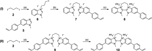 Scheme 2. Synthesis of the Styryl-BBI Monomer (I) and Cross-linker (II)aaReaction conditions: (a) 1-Methyl-1H-benzo[d]imidazole, MeCN, rflx., 4 h, 56%; (b) 5, MeCN, rflx., 36 h, 87%; (c) (i) KHMDS, DMF/toluene, rt, 1 h; (ii) C2Cl6, toluene, rt, 30 min; and (iii) NaPF6, MeOH/H2O, rt, 1 h, 53%; (d) 5, MeCN, rflx., 4 d, 82%; and (e) (i) KHMDS, DMF/toluene, rt, 1 h; (ii) C2Cl6, toluene, rt, 30 min; and (iii) NaPF6, MeOH/H2O, rt, 1 h, 52%.