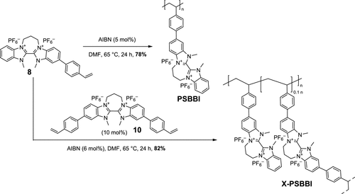 Scheme 3. Synthesis of the Linear and Cross-linked Polymers PSBBI and X-PSBBIFigure 2