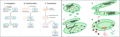 Figure 1. Canonical and noncanonical routes of HGT. (A) Conjugation involves cell-to-cell contact. (B) Transformation involves the uptake of extracellular DNA from the environment. (C) Transduction involves attachment of phage to bacteria followed by subsequent injection of its DNA into the host. (D) HGT through membrane vesicles, where bacteria release vesicles containing cellular materials that are taken up by recipient cells. (E) HGT through nanotubes, which are membrane extensions forming direct bridges between neighboring bacterial cells to enable exchange of cytoplasmic materials. (F) HGT through autolysis. Autolysis involves the self-lysis of a subpopulation of bacterial cells, releasing extracellular DNA that becomes available for uptake by naturally competent bacterial cells. (G) HGT via gene transfer agents (GTAs), which package host DNA fragments and release them upon lysis for uptake by recipient cells.