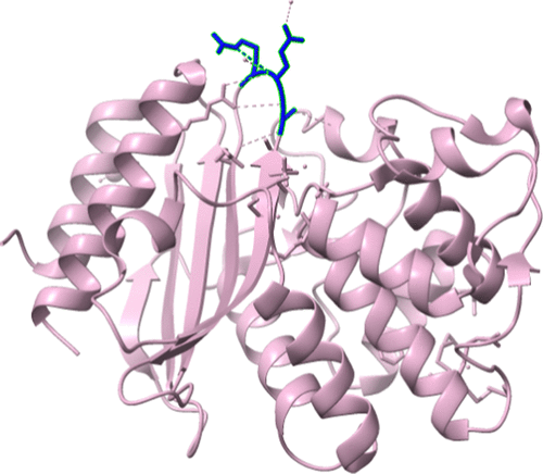 Figure 2. Crystal structure of stabilized TEM-1 beta-lactamase variant v.13 carrying G238S mutation. (129) The blue colored region with hydrogen bonding is the mutation region.