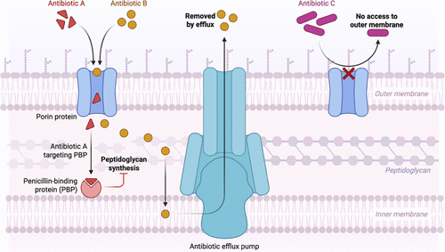 | enzymatic inactivation | enzymes degrade or modify antibiotics. | TEM, SHV, mecA, and other β-lactamases, aminoglycoside-modifying enzymes | plasmids (Inc.F, Inc.I, and Inc.P), class 1 integrons, transposons (Tn3 and Tn4401) |