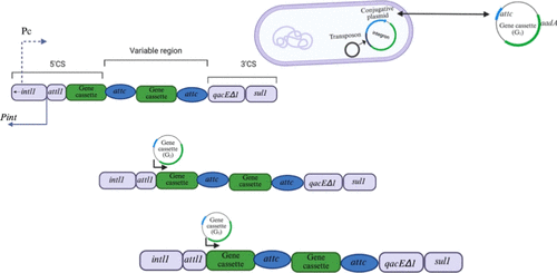 Figure 4. Structure of class 1 integrons. Integrons function as modular genetic elements that facilitate the acquisition, chromosomal insertion, and expression of gene cassettes, frequently encoding antibiotic resistance determinants, via a site-specific recombination mechanism catalyzed by an integrase enzyme.