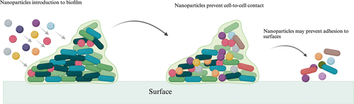 Figure 5. Proposed routes to control HGT. Nanoparticle disruption of the biofilm architecture, this essentially prevent cell proximity, thus preventing conjugation. In some cases, the nanoparticle may actively compete with the bacteria for the extracellular DNA. Sequestering the extracellular DNA is a route to limit resistance evolution.