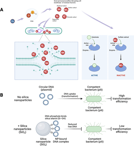 Figure 6. Proposed methods of controlling HGT in bacterial niche. (A) Iron activates the peroxymonosulfate (PMS) resulting to the production of radical species that degrade the cell membrane and disrupt enzyme metabolism, thus preventing conjugative transfer of resistance genes. (B) Silica nanoparticle binds to extracellular DNA by an attractive interaction between DNA phosphate groups and surface silanol groups on silica, thus sequestering the DNA and blocking transformation.
