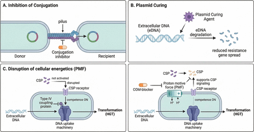 Figure 7. Strategies to control horizontal gene transfer. (A) Conjugation inhibiting drugs that inactivate components of proteins involved in the plasmid transfer machinery, specifically the Type IV coupling protein that links the relaxosome and the Type IV secretion system (T4SS). (B). Plasmid curing involves a variety of chemicals including detergents, biocides, DNA intercalating agents, antibiotics, psychotropic drugs, and plant-derived compounds that target eDNA for degradation. (C) Competence blockers (COM-blockers) disrupt the proton motive force, which inhibits quorum-sensing signaling via CSP, thereby preventing activation of the DNA uptake machinery.