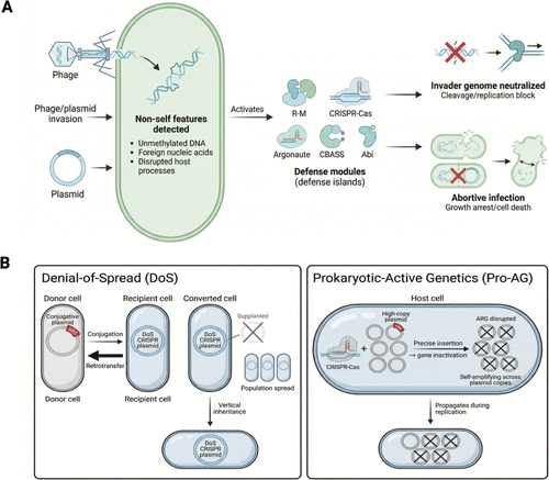 Figure 8. Bacterial innate immune defense against phages/plasmids. (A). Bacteria possess sophisticated innate immune mechanisms capable of mounting effective responses against invading phages and foreign genetic elements. These defenses comprise a diverse array of genetically encoded systems that are frequently colocalized within discrete genomic regions known as “defense islands”. The repertoire of characterized defense systems continues to expand and currently encompass restriction-modification systems, CRISPR-Cas machinery, Argonaute-based defense pathways, cyclic-oligonucleotide-based antiphage signaling systems (CBASS), and abortive-infection modules, each representing a functionally distinct strategy for detecting and neutralizing nonself-nucleic acids. (B). CRISPR-based prokaryotic gene drives targeting plasmid ARGs. Through this mechanism, the DoS plasmid is able to disseminate novel genetic information throughout a target bacterial population while simultaneously outcompeting the conjugative plasmid, displacing it not only as the primary vehicle of horizontal gene transfer but also as a heritable element passed vertically to daughter cells.