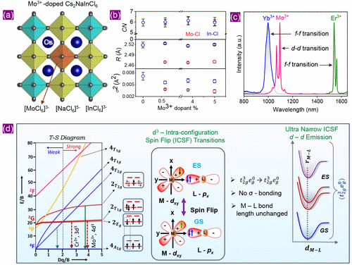 Figure 2. (a) Schematic representation of Mo3+-doped Cs2NaInCl6 double perovskite cubic lattice with the space group Fm3m. (b) Description of the Cl environment around Mo (red open symbols) and In (blue open symbols) for Mo3+-doped Cs2NaInCl6 with different dopant concentrations: coordination number (CN, top panel), bond length (R, middle panel), and local order (σ2, bottom panel). (c) d–d vs f–f transition-based NIR-II PL spectra from Ln3+- (Ln = Yb, Er) and Mo3+-doped Cs2NaInCl6. (d) Left panel: Tanabe-Sugano diagram for a d3 ion in an octahedral coordination; middle panel: schematic diagram comparing the orbital interaction between the metal (M) dxy ligand (L) px when the metal ion (d3: Cr3+, Mo3+, Re4+) is in the ground state (GS: 4A2g) and in an excited state (ES: 2Eg); right panel: schematic potential energy surface diagram, indicating that the ground state 4A2g, and excited states 2Eg/2T1g and 2T2g have the same t2g3eg0 electronic configuration and, therefore, have very similar M–L bond lengths. Reproduced with permission from ref (20). Copyright 2025 Wiley.