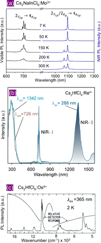 Figure 3. (a) Temperature-dependent (7–300 K) PL spectra of 3.8% Mo3+-doped Cs2NaInCl6 in the visible to NIR region under 438 nm excitation. Reproduced with permission from ref (20). Copyright 2025 Wiley. (b) PL and PL excitation spectra of Cs2HfCl6:Re4+ at room temperature. Reproduced with permission from ref (26). Copyright 2025 Elsevier. (c) PL spectrum of Cs2HfCl6:Os4+ crystals at 2 K. Since the spectrum was collected in a broad range from visible to NIR-II (∼580–2100 nm), the relative detector response is also shown. Reproduced with permission from ref (14). Copyright 1971 American Physical Society.