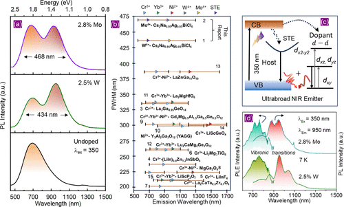 Figure 5. (a) PL spectra of undoped, 2.5% W-doped and 2.8% Mo-doped Cs2Na0.95Ag0.05BiCl6 under the excitation of 350 nm, showing unprecedented spectral widths of 434 and 468 nm, respectively. The spectra were collected using two detectors and then combined at 720 nm. (b) fwhm of various reported broadband NIR emitters is compared with that of 2.5% W-doped and 2.8% Mo-doped Cs2Na0.95Ag0.05BiCl6. The composition of various NIR emitters is mentioned in the figure with serial numbers that correspond to a table reported in the Supporting Information of ref (46). The position of the tringles indicates the PL peak position(s) of the broadband NIR PL, while the solid and dashed lines show the emission wavelength range coverage with continuity and discontinuity, respectively. The colors of the triangle indicate various dopants, as stated at the top of the figure. Different PL peak for a single dopant due to occupation of two different lattice sites is indicated by tringle of same color with dashed and solid edges. (c) Schematics summarizing the excitation and emission pathways for ultrabroadband NIR emissions from W-doped and Mo-doped Cs2Na0.95Ag0.05BiCl6. (d) PL and PL excitation of 2.5% W-doped and 2.8% Mo-doped Cs2Na0.95Ag0.05BiCl6 at 7 K. Reproduced with permission from ref (49). Copyright 2025 Wiley.