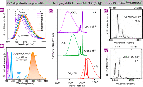 Figure 6. (a) NIR PL of Ga1.98–x(Al0.68In0.32)xO3:2% Cr3+ (x = 0–0.8) at room temperature. Reproduced with permission from ref (57). Copyright 2022 American Chemical Society. (b) Normalized absorption (violet), PL emission (orange), and PL excitation (blue) spectra of Cs2AgInCl6:1.3% Cr3+ nanocrystals. Reproduced with permission from ref (58). Copyright 2022 American Chemical Society. (c) Low-temperature (4 K) PL spectra of CrX3 (X = Cl, Br, I) showing broad PL due to 4T2g → 4A2g, and corresponding Yb3+-doped CrX3 showing sharp PL due to 2F5/2 → 2F7/2 transition of Yb3+. The absence of lattice PL in the latter indicates efficient ET from Cr3+ to Yb3+. Reproduced with permission from ref (59). Copyright 2023 American Chemical Society. (d, e) NIR to visible upconversion (UC) photoluminescence of Re4+-doped Cs2NaYCl6 and Cs2NaYBr6 at 15 K respectively. Reproduced with permission from ref (17). Copyright 1998 American Chemical Society.