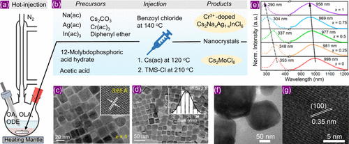 Figure 7. (a) Hot-injection synthesis setup for colloidal nanocrystals. (b) Precursors and reaction conditions used to prepare (top panel) Cr3+-doped Cs2NaxAg1–xInCl6 (x = 0–1) and (bottom panel) Cs2MoCl6 nanocrystals. (c, d) TEM images of Cr3+-doped Cs2NaInCl6 nanocrystals. Inset images of (c) and (d) show high resolution TEM and size distribution of nanocrystals. (e) Room temperature PL of Cr3+-doped Cs2NaxAg1–xInCl6 (x = 0 −1) colloidal nanocrystals under different excitations. (c)–(e) were reproduced with permission from ref (58). Copyright 2022 American Chemical Society. (f–g) TEM and high-resolution TEM images of Cs2MoCl6 nanocrystals. Reproduced with permission from ref (77). Copyright 2024 American Chemical Society.